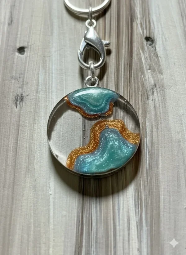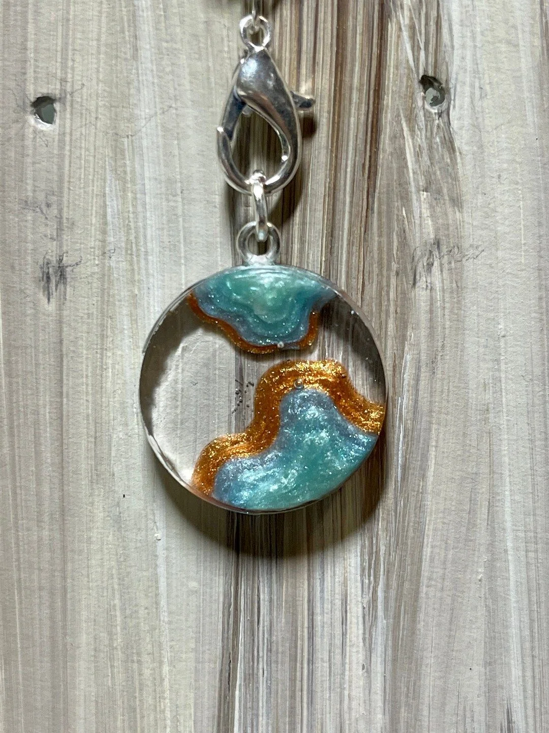 A handcrafted circular resin charm featuring mesmerizing swirls of shimmering teal and copper, complete with a silver lobster clasp. Perfect as a stylish keychain or bag accessory.