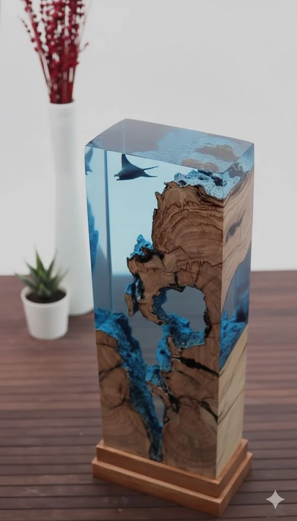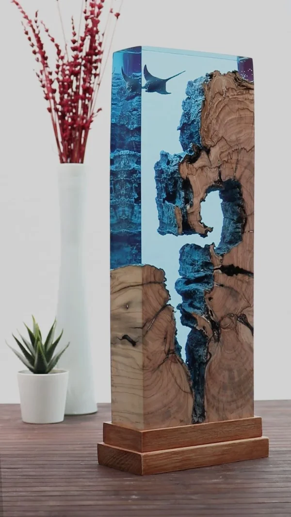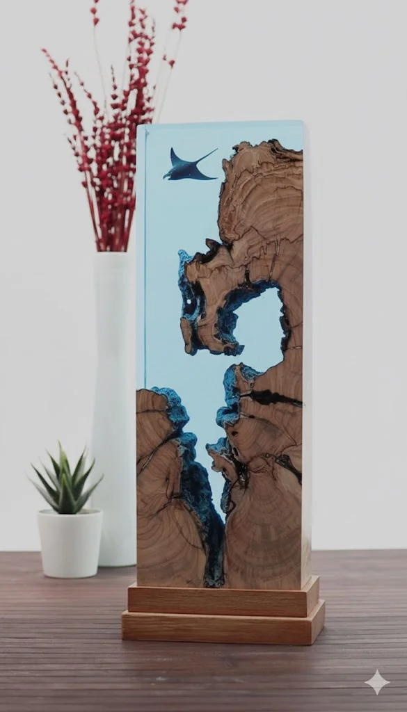 A mesmerizing handcrafted sculpture combining ancient wood and deep blue resin with a swimming manta ray, designed to evoke the serenity of the ocean depths. Functions as a unique art piece and ambient lamp.