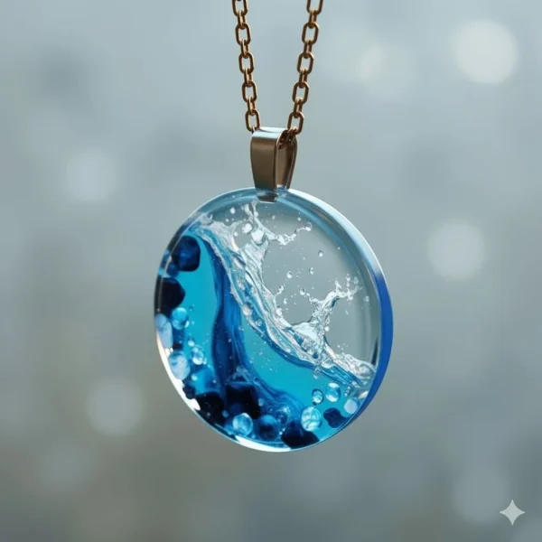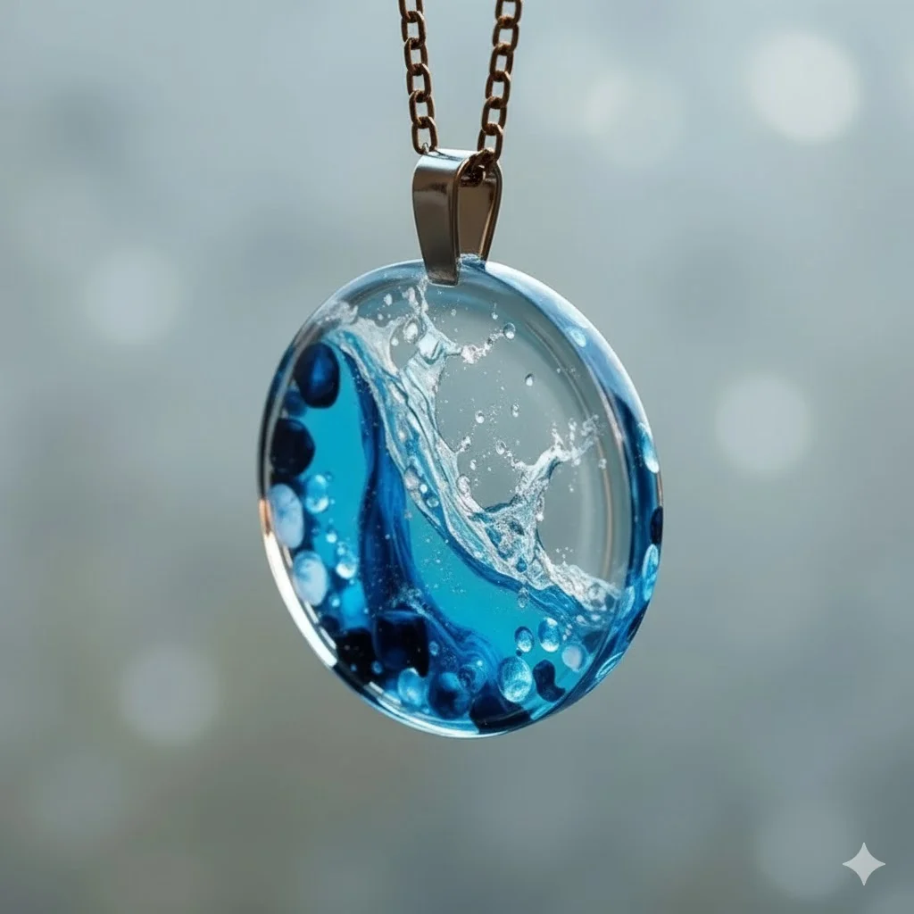 A captivating handcrafted circular resin pendant necklace featuring a miniature 3D ocean wave with splashes and “pebbles,” suspended from a delicate chain. Perfect for ocean lovers.